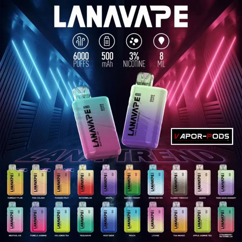 | กลิ่น LANA TREND 6000 คำ | Watermelon, Sakura Yogurt, Grape, Guava, Tieguanyin, Menthol Ice, Root Beer, Peach, Spring Water, Taro Sago Dessert, Thai Mango, Classic Tobacco, Lychee, Ice Lemon Tea, Pomelo Jasmine |