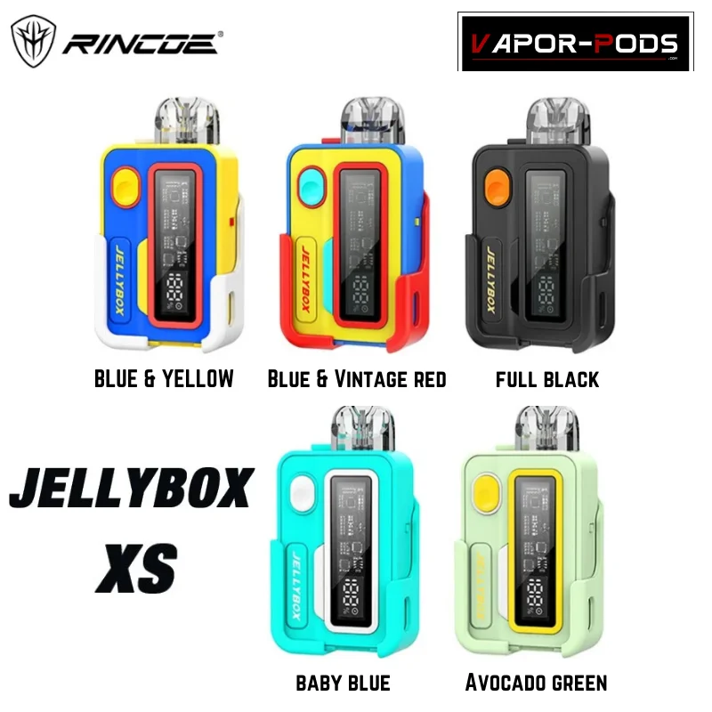 Rincoe JellyBox XS เป็นพอตบุหรี่ไฟฟ้าที่มีดีไซน์สวยงาม คล้ายๆเพจเจอร์ ลักษณะเป็นกล่องสีเหลี่ยมขนาดพอดีมือ และมีน้ำหนักเบา มาพร้อมกับแบตเตอรี่ 1000mAh ปรับวัตต์ได้ และความจุของพอต 2 มิลลิลิตร สามารถเปลี่ยนสลับกรอบแผ่นหน้าตัวเครื่องได้และมีไฟ LED หลากสี นอกจากนี้ยังมีความเร็วในการจ่ายไฟที่รวดเร็วและมีการปรับรูลมเพื่อปรับฟีลสูบได้ รวมถึงตัวเลือกการสูบทั้งแบบปุ่มกดและอัตโนมัติ